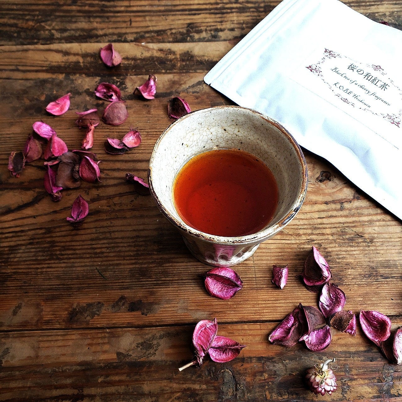 鹿児島県産の茶葉を優しく穏やかな味わいの紅茶に仕上げ、静岡県産の桜の葉を砂糖漬けにして、紅茶にブレンド。仄かに甘く香る桜。