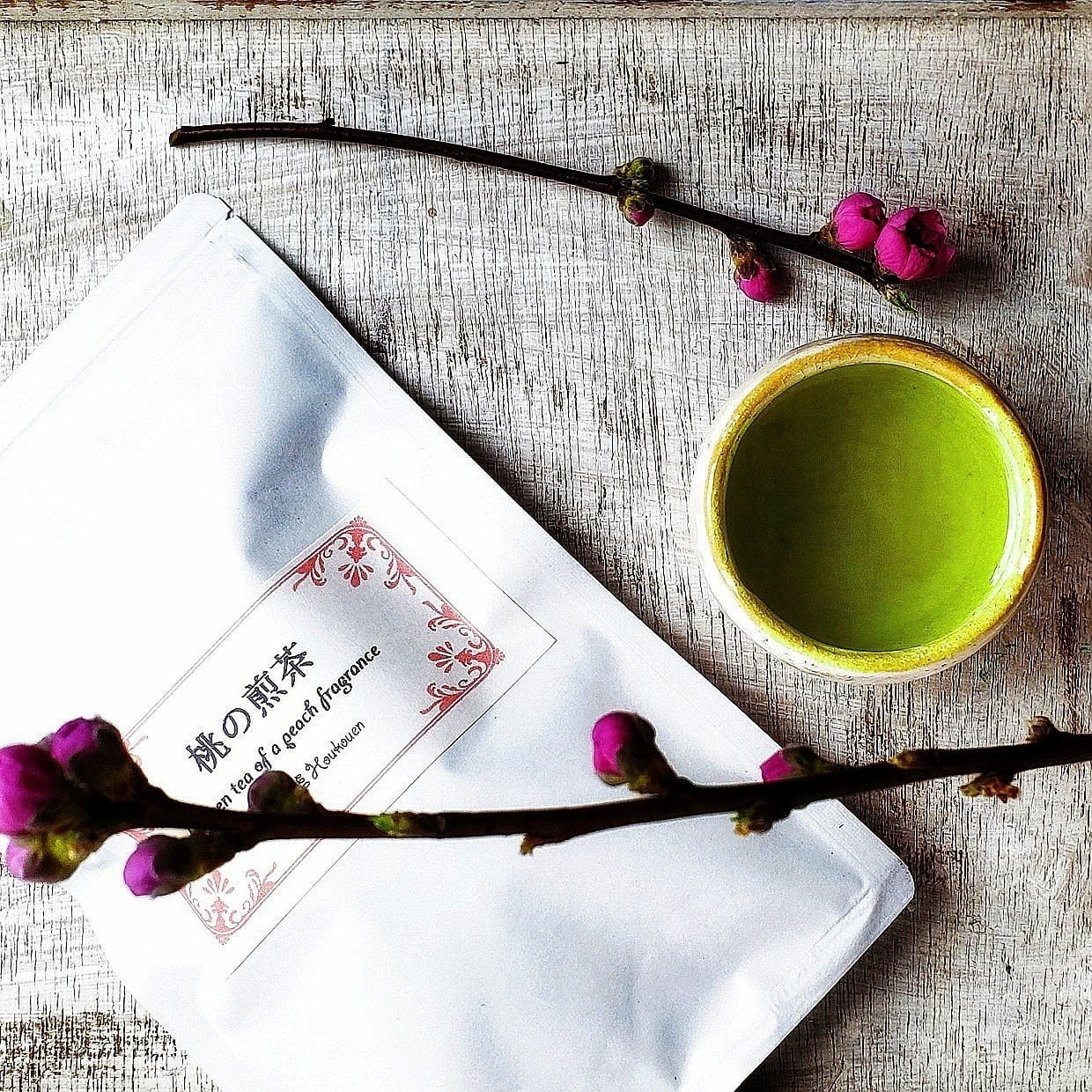 爽やかな煎茶(鹿児島県産)にフリーズドライの白桃をブレンド。ティーバッグをカップに落とし、お湯を注ぐとふんわりと桃が香ります。