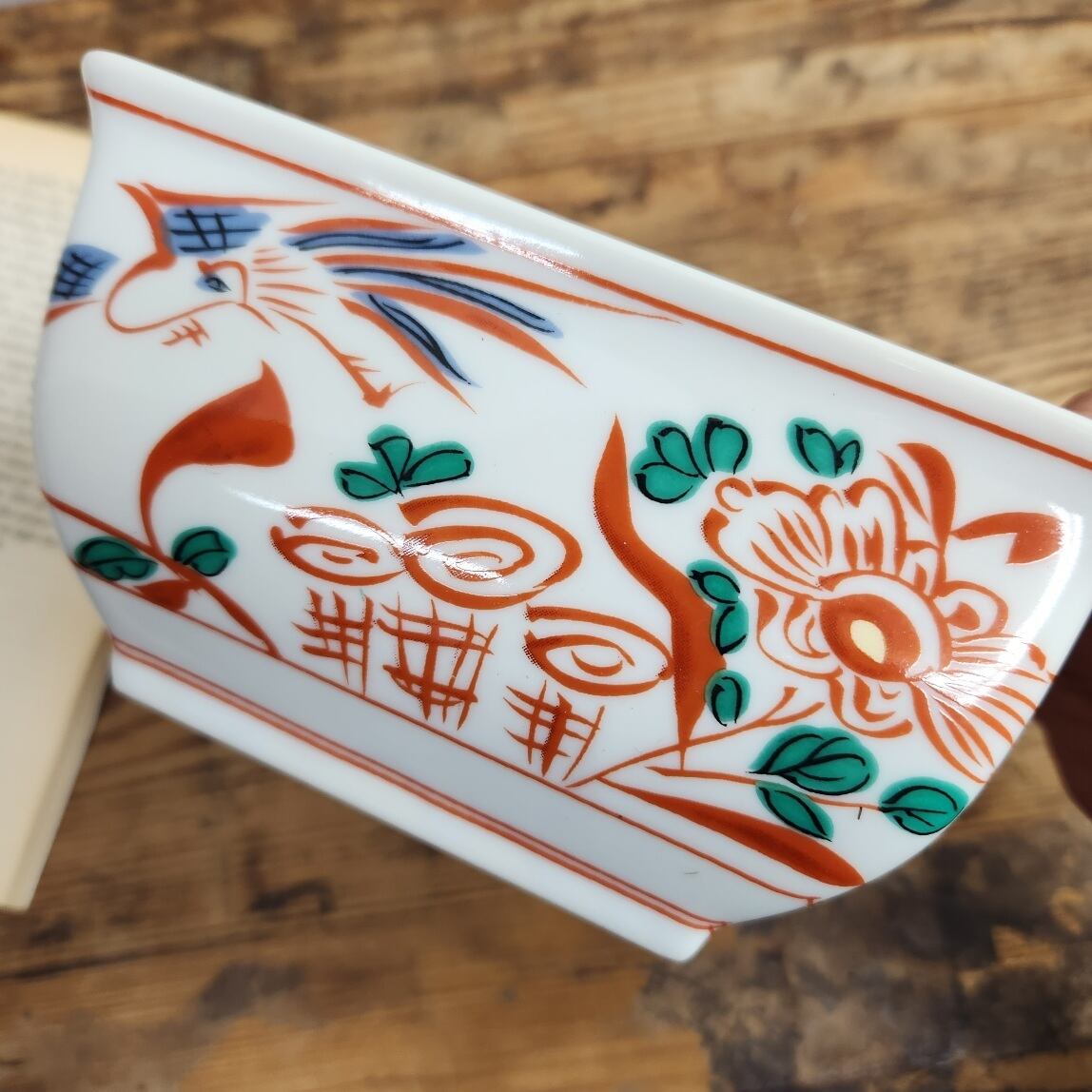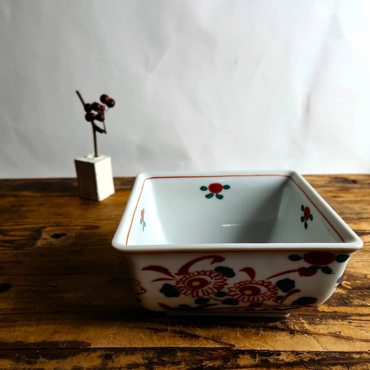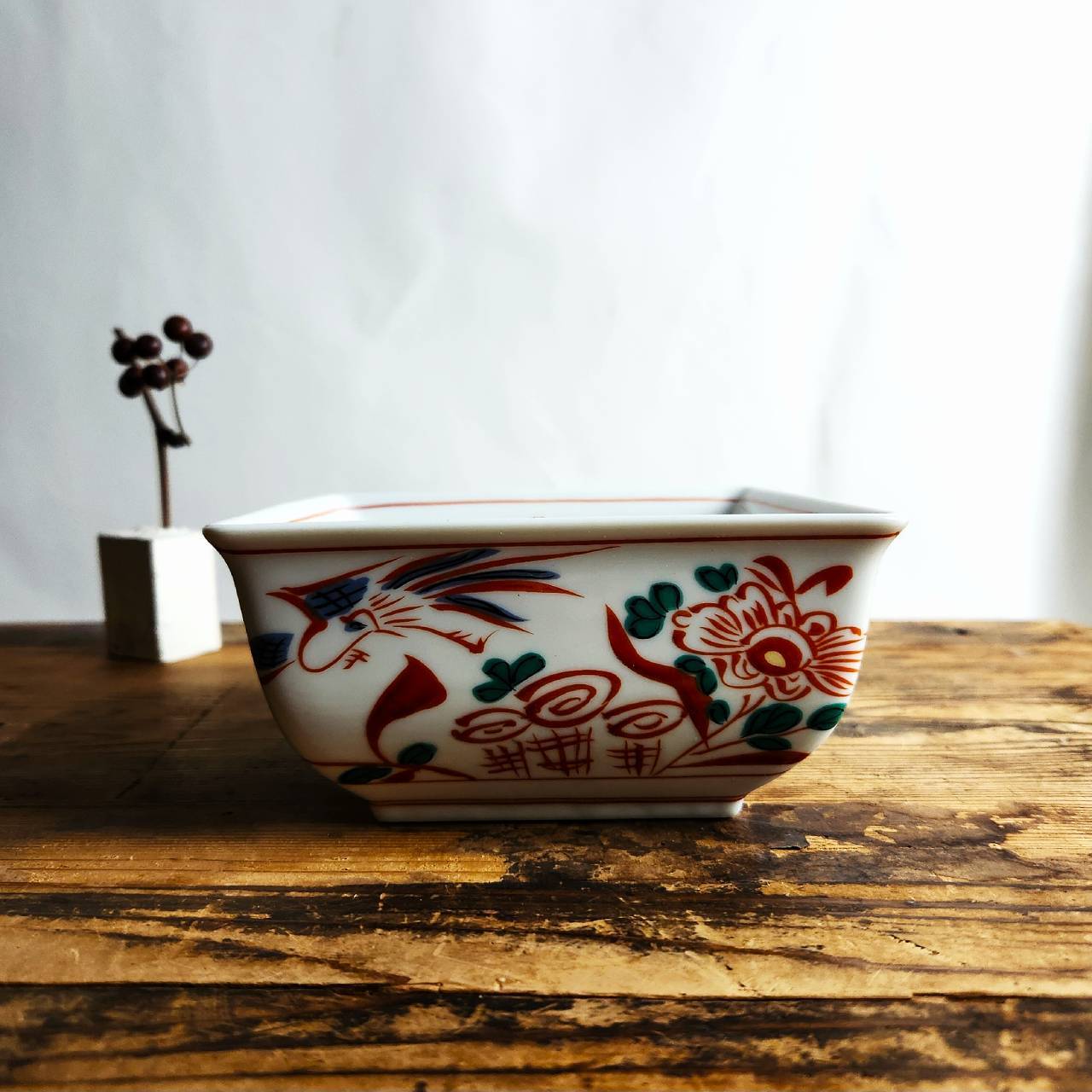 朱色をメインに緑や紺を配した華やかな配色角鉢です。食卓が華やかに映える赤絵、使い勝手の良いサイズ感の器です。
