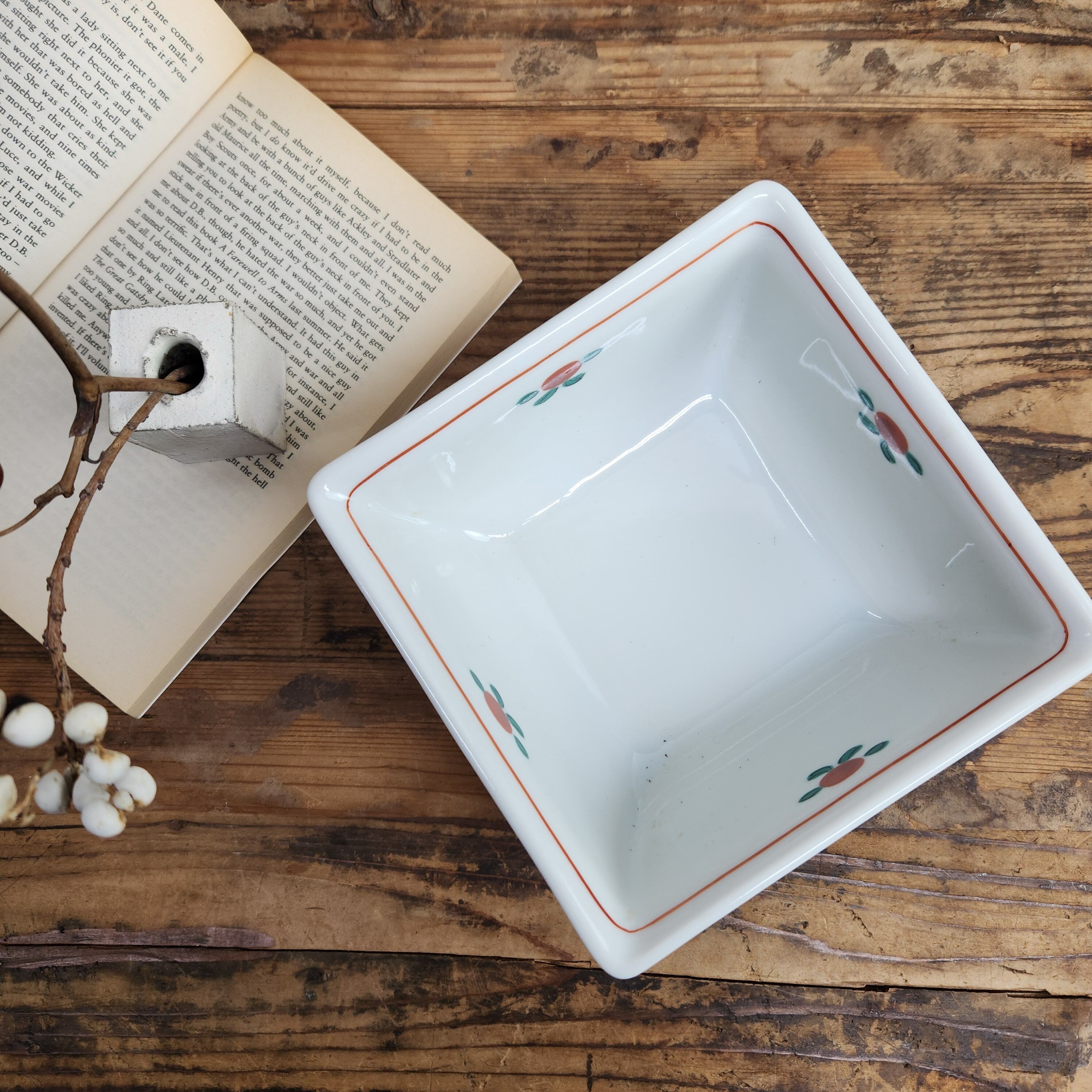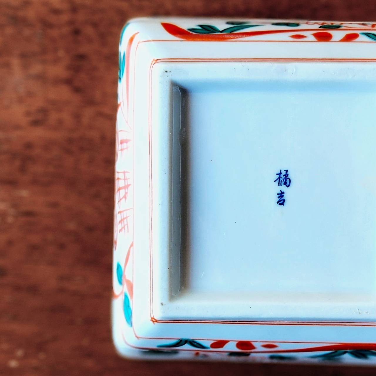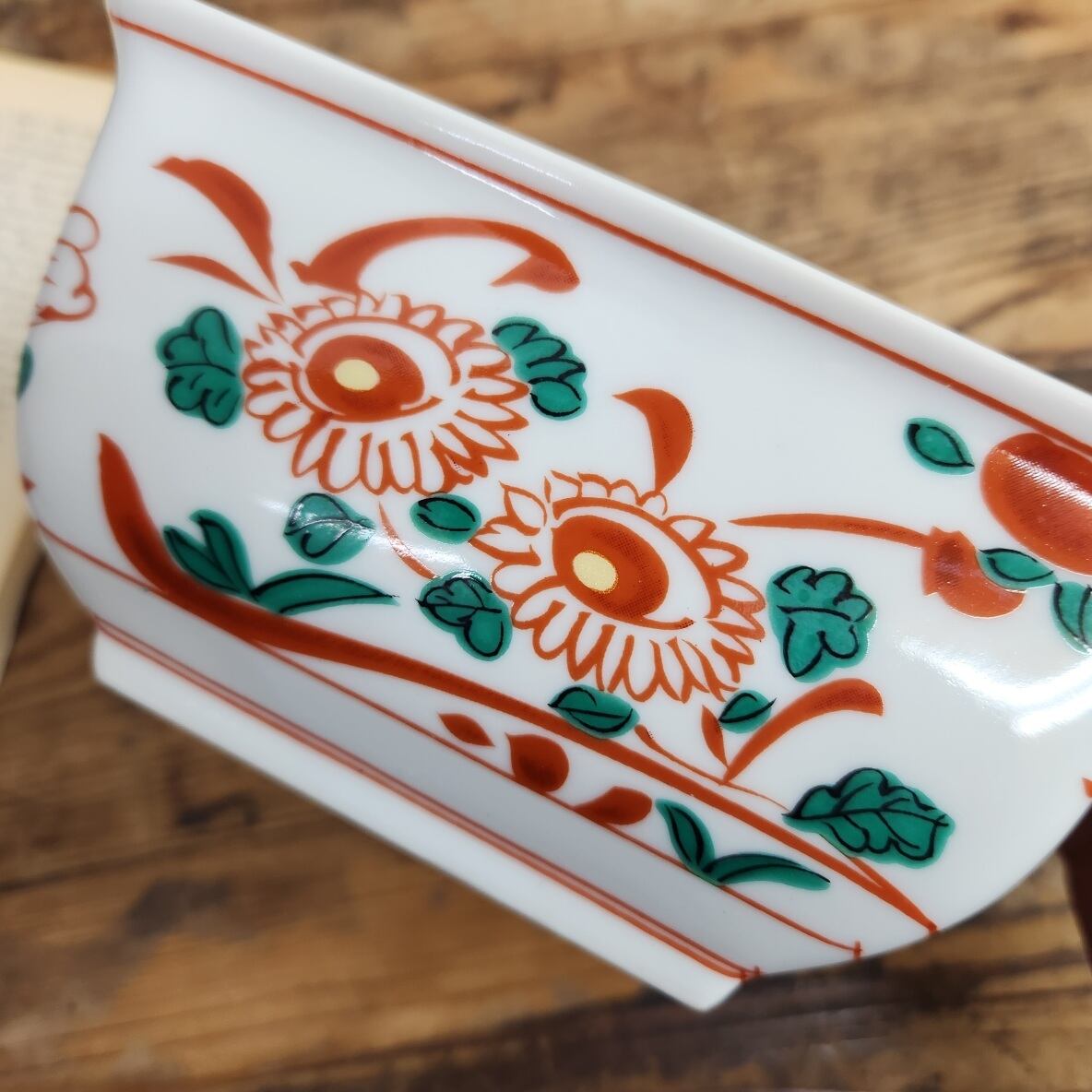 朱色をメインに緑や紺を配した華やかな配色角鉢です。食卓が華やかに映える赤絵、使い勝手の良いサイズ感の器です。