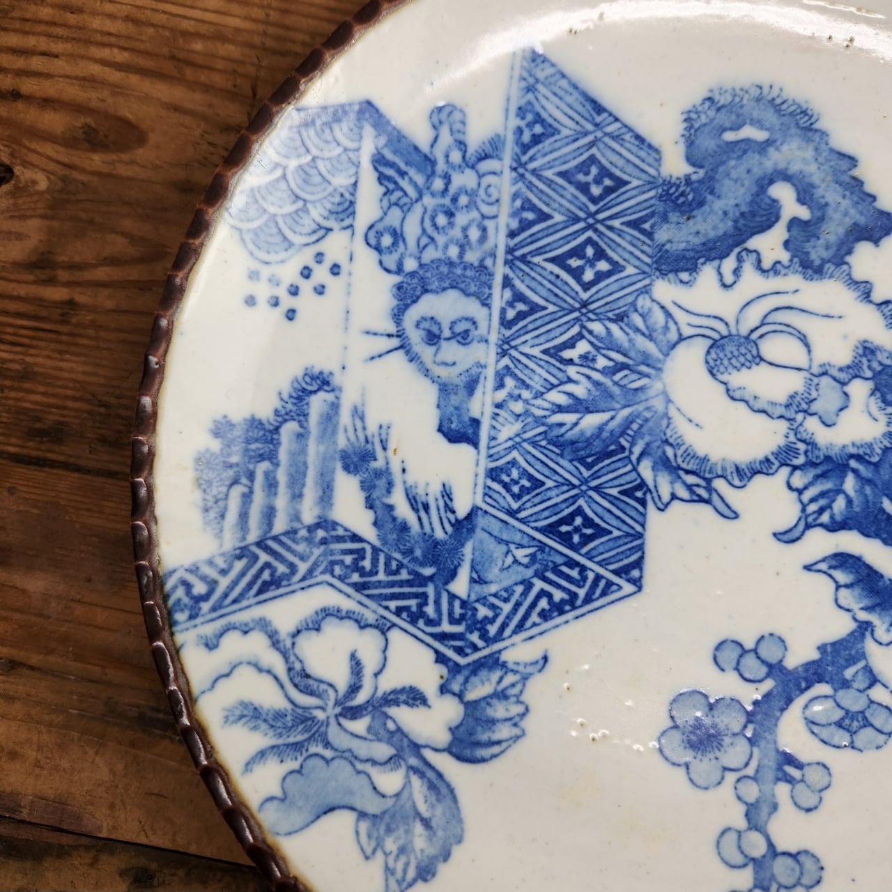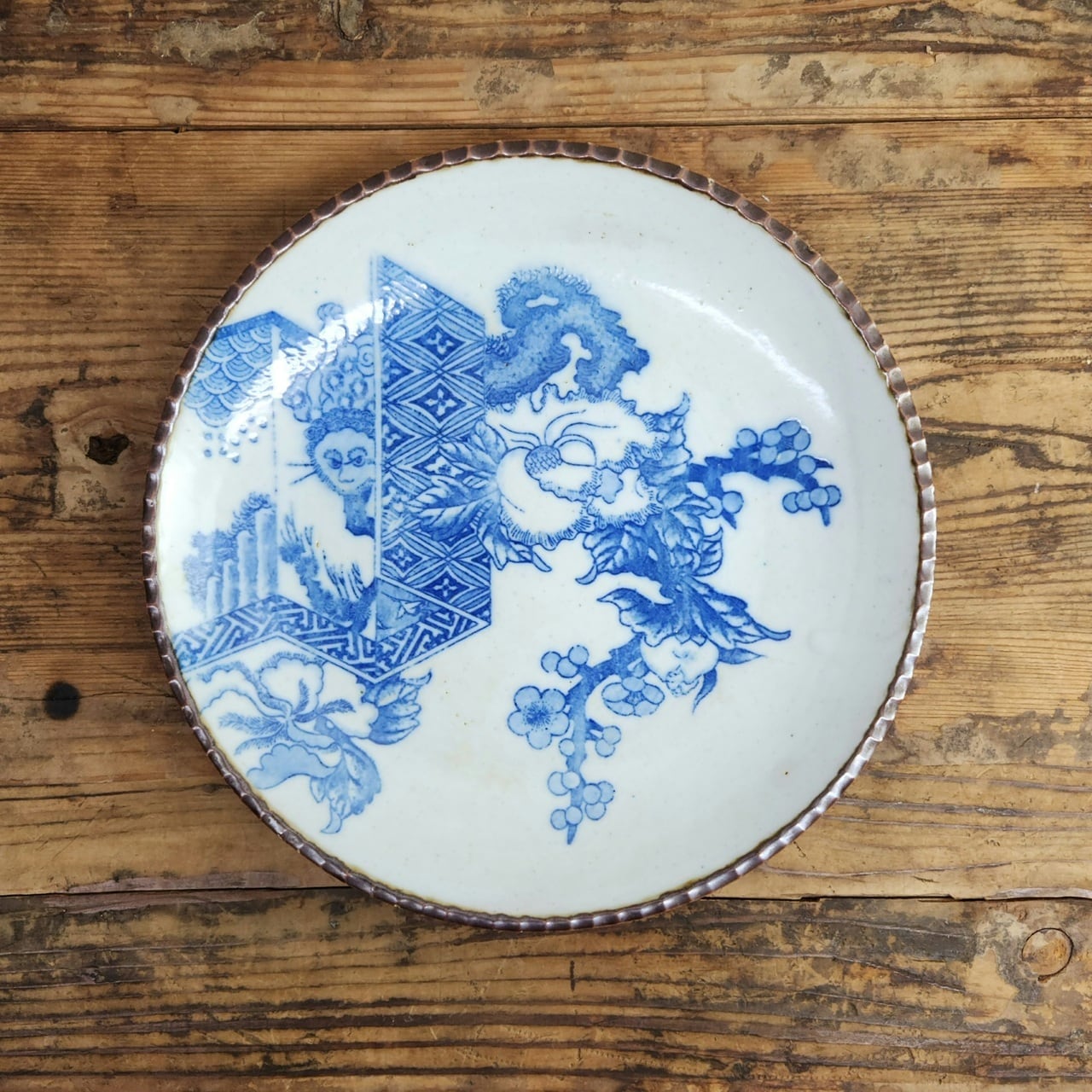 このお皿は、富貴(牡丹)と厄除け(猿)が、春(梅)とともに訪れるという非常にポジティブなメッセージが込められています。